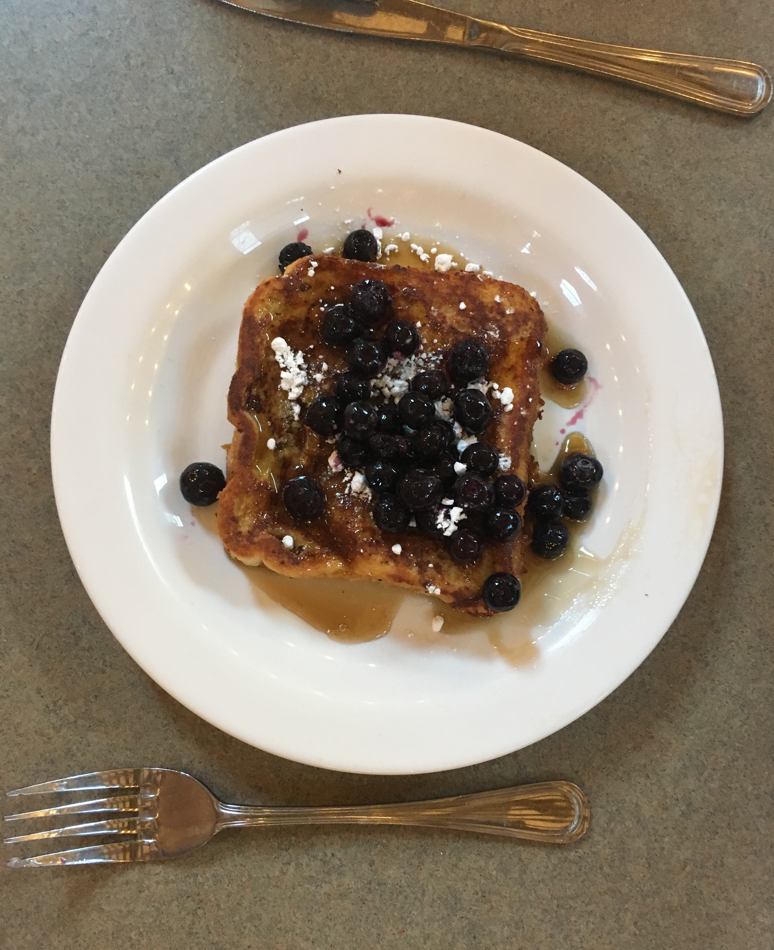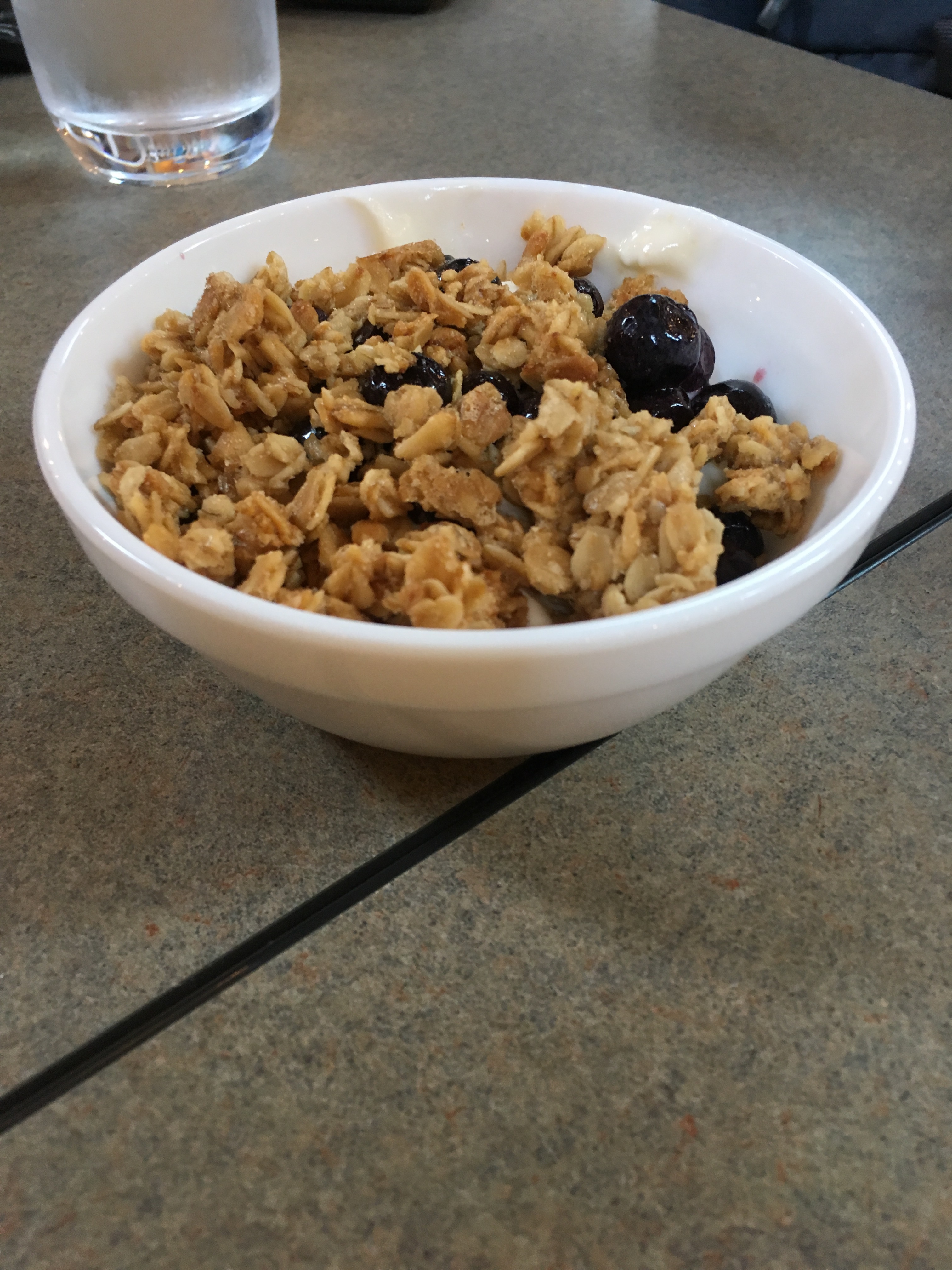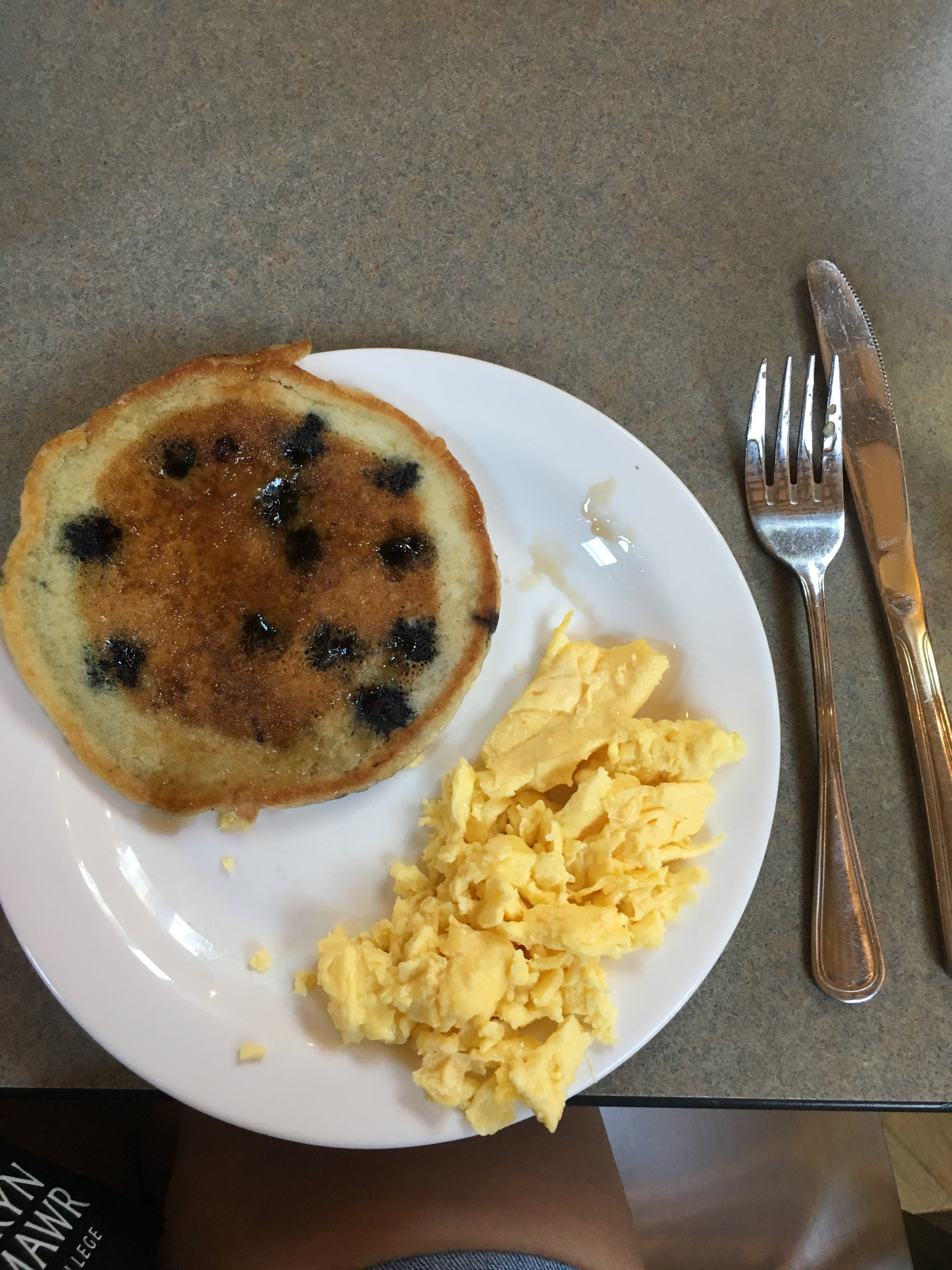 The first picture is the breakfast served on Friday the 12th at the Erdman Dining Hall on the Bryn Mawr College campus. It is a slice of french toast with syrup, powdered sugar, and blueberries. The syrup wasn’t maple syrup like I expected, just pure sugary corn syrup which was too runny and way too sweet, the blueberries were frozen and really rock solid. The only thing good about it was the actual french toast itself. I rate this a 3/10. Second is a bagel with cream cheese and cantaloupe. The bagel was chewy and hard to bite, though it still tasted good. The cantaloupe was sour, and also really hard to bite into. I’d rate this meal low, with a 4/10. Next was a yogurt parfait, which of course had vanilla yogurt, granola, and blueberries. This was probably the healthiest thing the dining hall serves for breakfast, which may be hard to believe, but the only other options are sugary cereal, bagels, toast, and pancakes, so I think getting a yogurt parfait is one of the best options at the Erdman Dining Hall, I rate it 8/10. The dining hall’s average breakfast rating is 5/10.